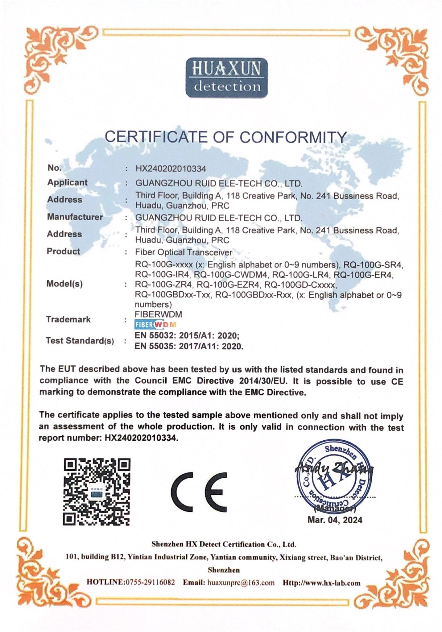 Le certificat CE de Fiberwdm confirme son adhésion aux normes européennes en matière de sécurité et de qualité des produits dans les dispositifs optoélectroniques et les systèmes de réseaux optiques.