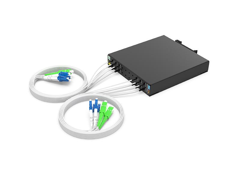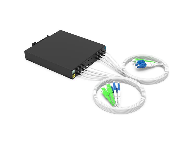 2CH CWDM OADM prend en charge 8 canaux de différence pour les activités commerciales vers l'ouest et 8 canaux de différence pour les activités commerciales vers l'est (suppression et ajout de 8 canaux du côté différent).