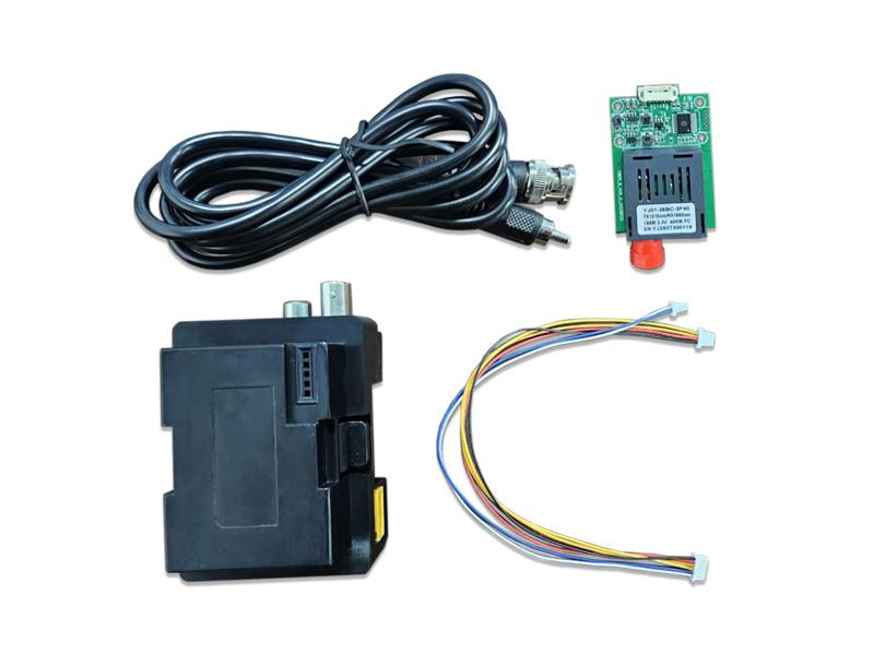 La prise de terre est directement intégrée au compartiment JR de la télécommande TX12. Son port FC est connecté à la fibre optique libérée par le tube. L'interface de signal analogique de la prise de terre est sélectionnée en fonction du dispositif d'affichage utilisé, à l'aide d'un câble TRRS et d'un câble adaptateur RCA vers BNC. La prise de terre ne nécessite pas d'alimentation externe. Elle peut être alimentée directement par la télécommande. Si l'alimentation de la télécommande est utilisée, il est nécessaire de s'assurer que celle-ci est suffisante.